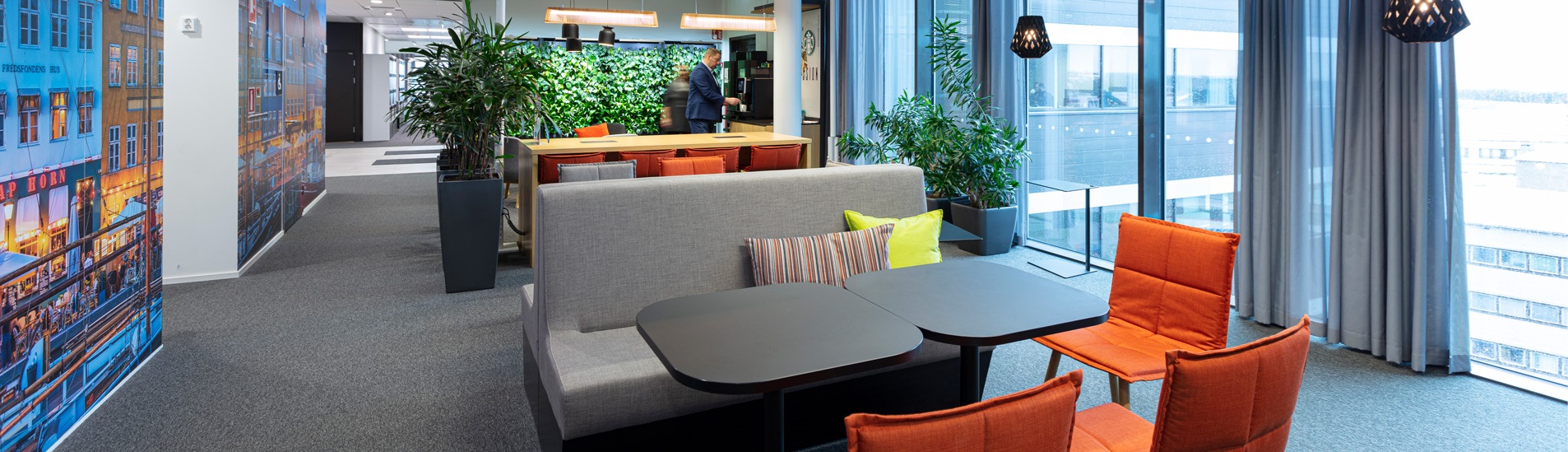Vasemmalla kuva uudesta lämpimästi sisustetusta Working Cafe -tilasta, jossa voi sekä työskennellä että ruokailla. Erityisen houkuttelevaksi sen tekee kaksi vapaassa käytössä olevaa kahvikonetta. Tilaan tuo väriä ja syvyyttä valokuvaseinä, jossa on kuva yhtiön kotipaikasta Kööpenhaminasta. Oikealla kuva vanhasta taukotilasta.