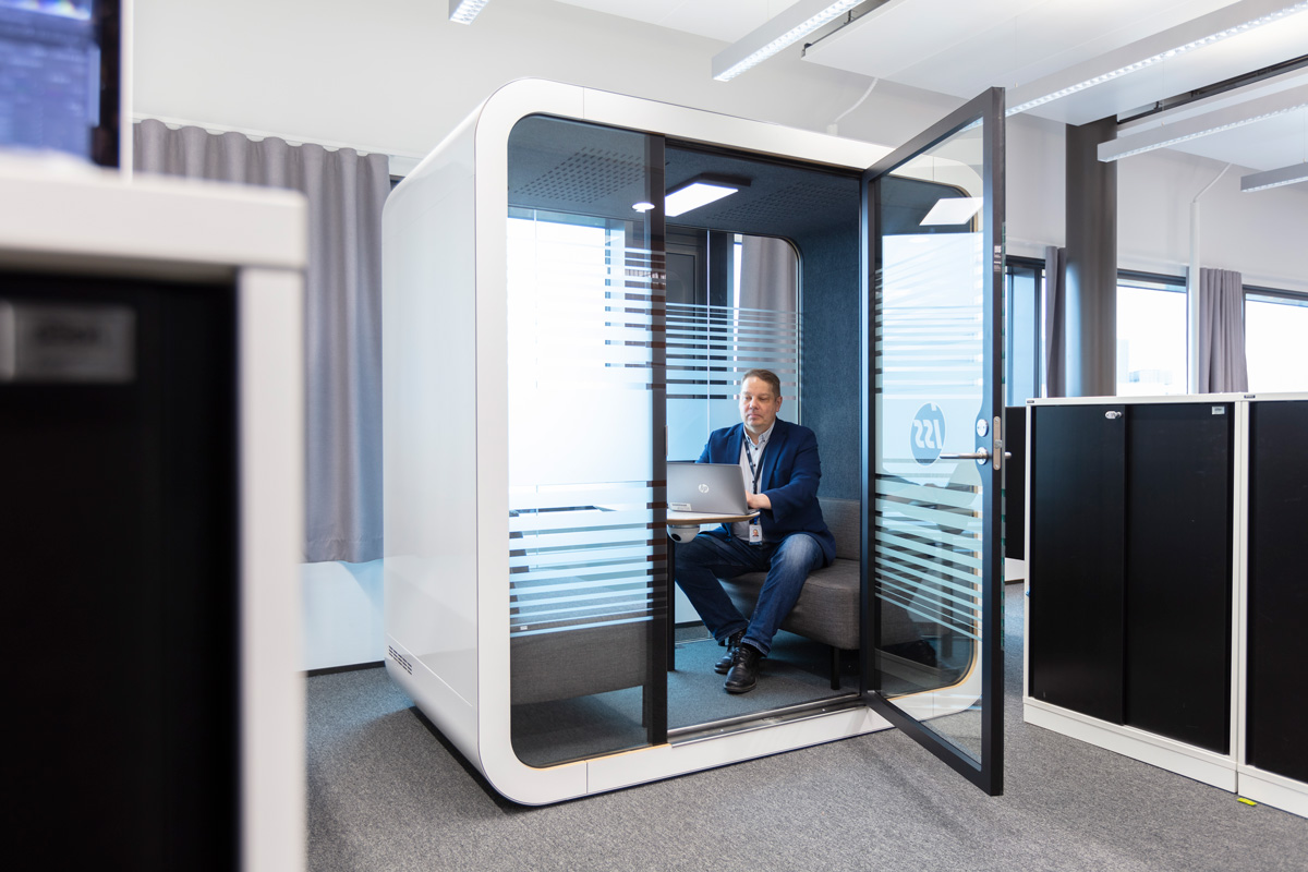 ”Ad hoc -tiloja ja näitä äänieristettyjä työtiloja tarvitaan paljon, kaikilla on nykyään runsaasti palavereita verkon kautta.”